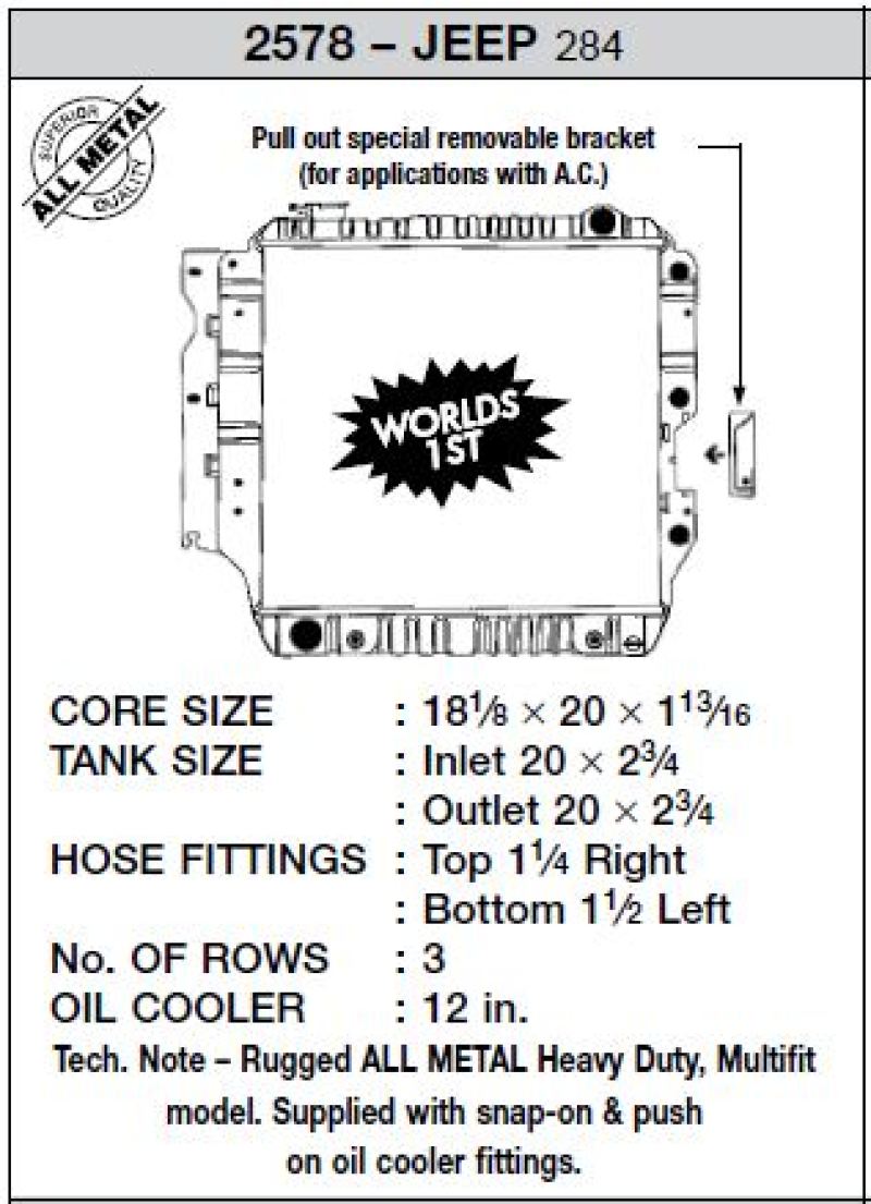 World exclusive multi-fit model, only from CSF - fits all automatic and manual Wrangler YJ and TJ models. CSF's #1 selling copper/brass Jeep model with over 20,000 sold - a cult favorite among Jeep enthusiasts who wish to keep their original style copper/brass radiator, but desire higher performance and more durability. CSF has over 5 decades of experience manufacturing radiators. So when it comes to keeping your engine cool and your Wrangler running at its finest, a CSF Heavy-Duty Radiator is the obvious choice. CSF has spent years refining and improving their radiator designs. The original style copper/brass construction features ribbed brass end tanks for additional strength and reinforced side end plates and integrated metal core straps to withstand heavy vibration and chassis flex while off-roading. The 3-Row 46mm Heavy-Duty and High-Performance Copper Core offers the best cooling available in a design that is a true "drop-in" fit with no modifications necessary for installation. Whether you are off-roading, towing, or just casually driving your Wrangler, trust the cooling experts at CSF for the best performing, high-quality, and reliable radiators.