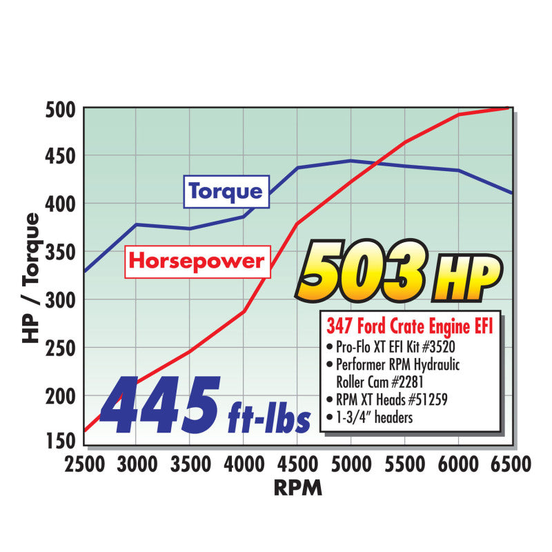 Edelbrock Rollin' Thunder Camshaft #2281 is designed for 351W Ford V8 engines and produce optimum torque from the low-end to the mid-range. Rollin' Thunder camshafts match with Performer manifolds for vehicles operating from off-idle to 5500 rpm. They are smooth idling cams for daily drivers, trucks, vans, RVs and 4x4s. You can expect a major improvement in throttle response and torque. In the manifold section you'll find torque graphs showing the power gains from Performer manifolds and Performer-Plus cams. All camshafts include flat tappet lifters (except for cams designed for use with stock roller lifters), assembly lube and instructions. This cam produced 449HP and 413 Ft Lbs of Torque when paired with RPM Air-Gap Dual Quad intake manifold #75354 and Performer RPM cylinder heads #60255. Must use a high stall torque converter. Will not work with stock valve springs. Camshaft specifications: - Intake duration: 235 Degrees - Exhaust duration: 238 Degrees - Intake lift: .573" - Exhaust lift: .582" - Lobe separation: 112 Degree - Intake Center Line: 107 - Vacuum: 10"
