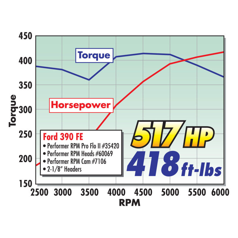 Edelbrock part #7106 Performer RPM Camshaft is designed for Ford FE 390-428 V-8 applications. This Edelbrock cam kit produced 418 HP & 434 ft-lbs. of torque when used with #7105 intake and #60069 cylinder heads on a 390 engine. The camshaft works well with high-performance's street applications, Performer RPM cams provide power from 1500 to 6500 rpm. This hydraulic lifter camshaft is dyno-matched to Performer RPM manifolds for high-rpm horsepower while still maintaining acceptable low-end torque. With 10 to 12 inches of manifold vacuum at idle, Performer RPM cams have more lift and duration than most street camshafts. Hydraulic flat tappet lifters are included with each Performer RPM camshaft. Camshaft Specifications: - Duration @ .050 Intake: 236 degrees - Duration @ .050 Exhaust: 236 degrees - Lift @ Valve Intake: .572" - Lift @ Valve Exhaust: .572" - Lobe Separation: 108 Degrees - Intake Centerline: 103 Degrees - Idle Vacuum @ 1000 RPM's: 11"
