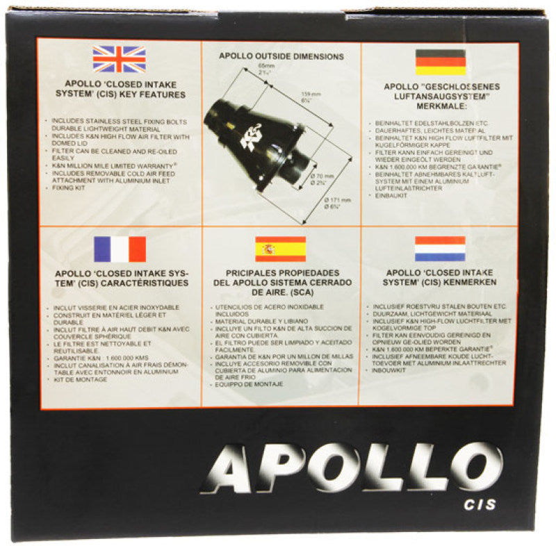 K&N Apollo Cold Air Induction Systems incorporate a washable/reusable K&N High-Flow Air Filter within a protective shell. They come with custom mounting hardware to fit specific vehicle applications. The Apollo's shell reduces heat build-up and feeds cool air into your engine, resulting in improved volumetric efficiency and increased power gains. Apollo Cold Air Induction Systems allow for updating your vehicle's intake system while retaining a closed environment.