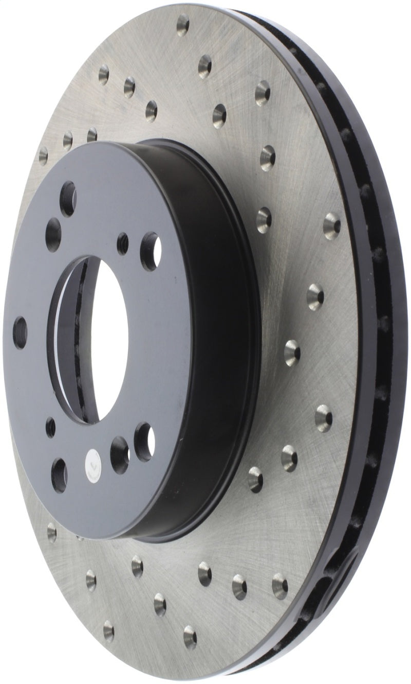 StopTech Drilled Sport Rotors are 1-piece direct replacement brake discs for factory brake systems and stock calipers that look great behind your wheels – and offer significantly improved braking performance. The unique cross-drilling aids with heat and brake dust dispersal, prevents glazing of the pads, adds bite and improves wet and dry braking performance. Built to last, the black e-coating provides protection from corrosion and the high carbon metallurgy (in most applications) offers quieter operation, better crack resistance and increased performance.