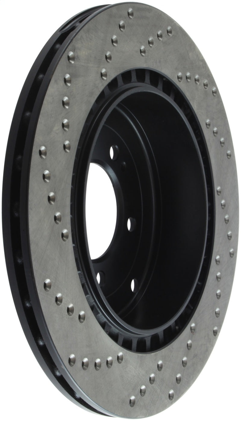 StopTech Drilled Sport Rotors are 1-piece direct replacement brake discs for factory brake systems and stock calipers that look great behind your wheels – and offer significantly improved braking performance. The unique cross-drilling aids with heat and brake dust dispersal, prevents glazing of the pads, adds bite and improves wet and dry braking performance. Built to last, the black e-coating provides protection from corrosion and the high carbon metallurgy (in most applications) offers quieter operation, better crack resistance and increased performance.