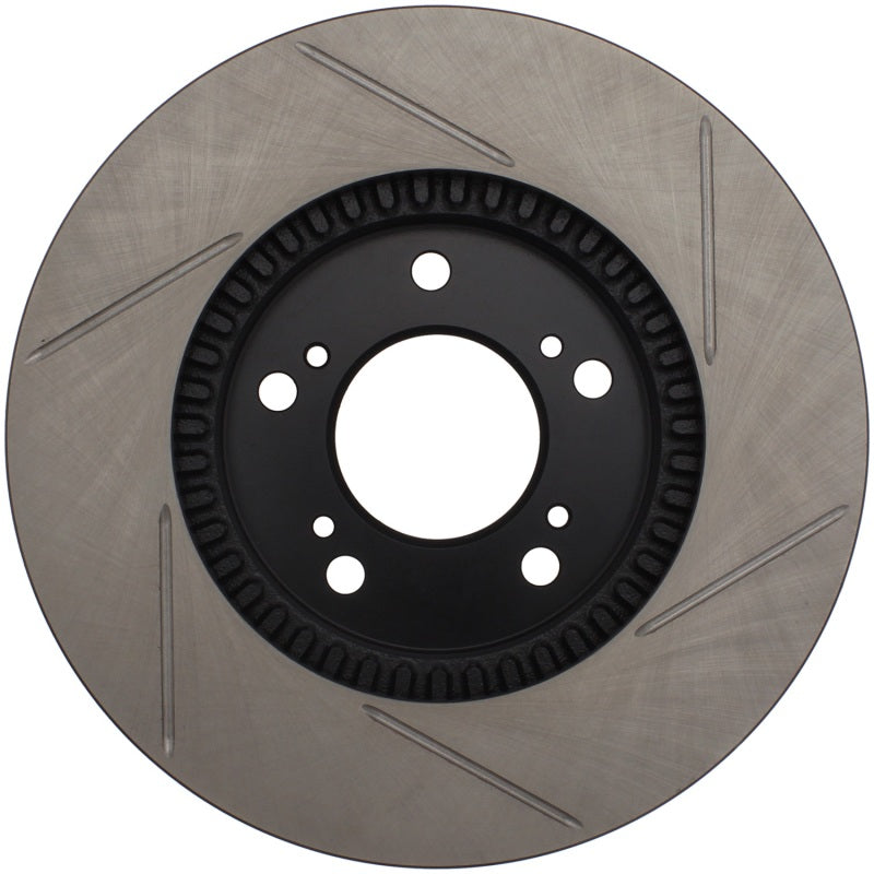 StopTech Slotted Sport Rotors are 1-piece direct replacement brake discs for factory brake systems and stock calipers that look great behind your wheels – and offer significantly improved braking performance. The unique slotting aids with heat and brake dust dispersal, prevents glazing of the pads, adds bite and improves wet and dry braking performance. Built to last, the black e-coating provides protection from corrosion and the high carbon metallurgy (in most applications) offers quieter operation, better crack resistance and increased performance.